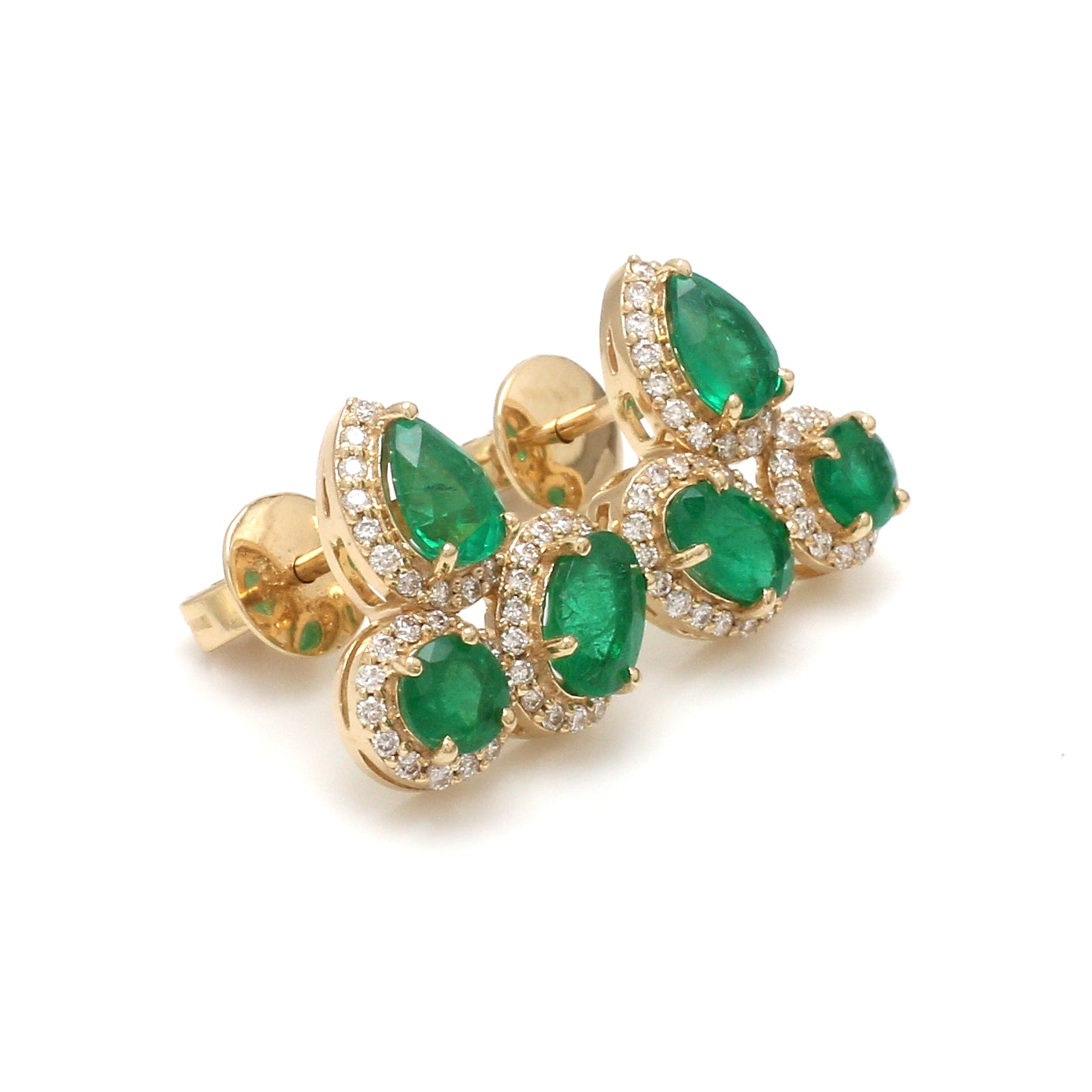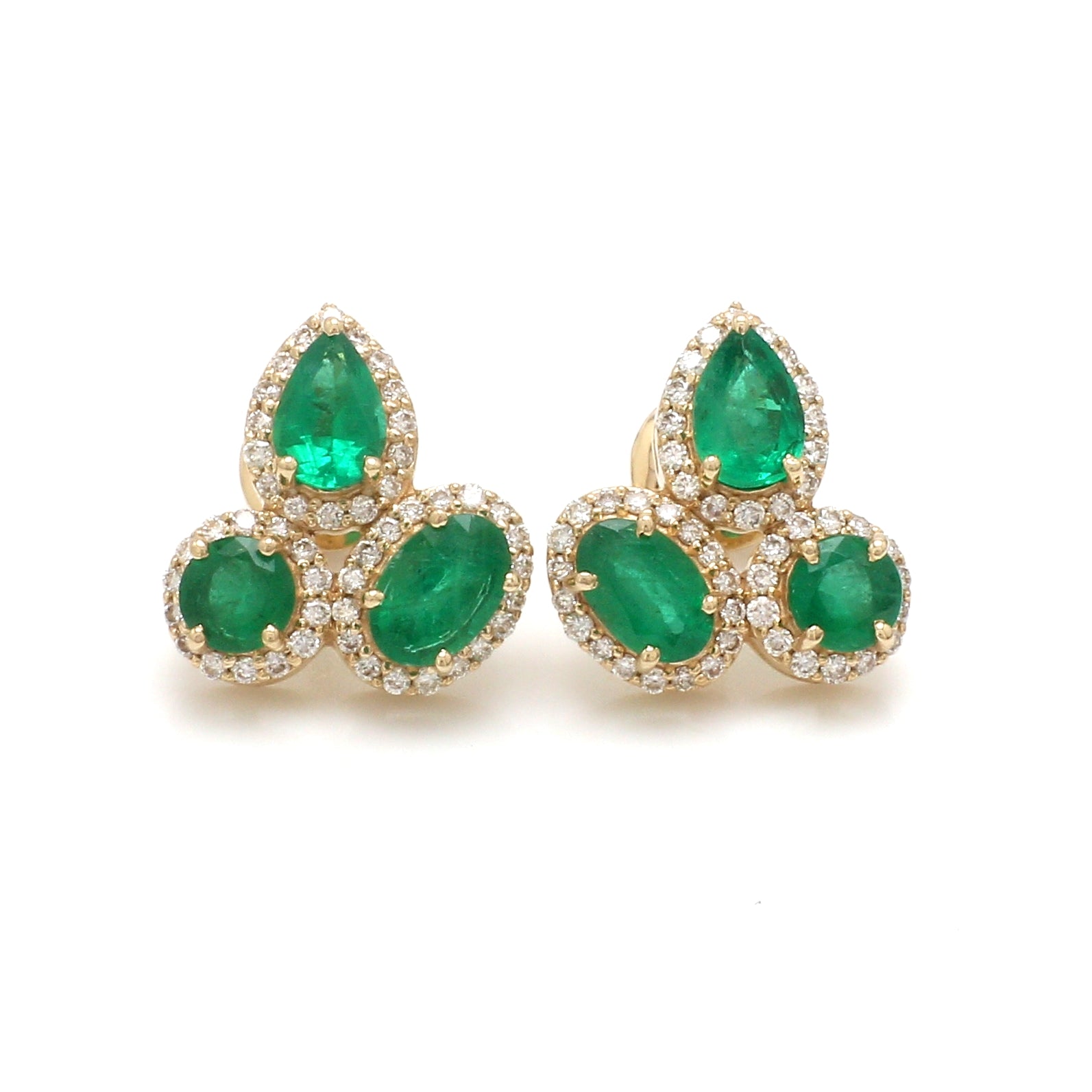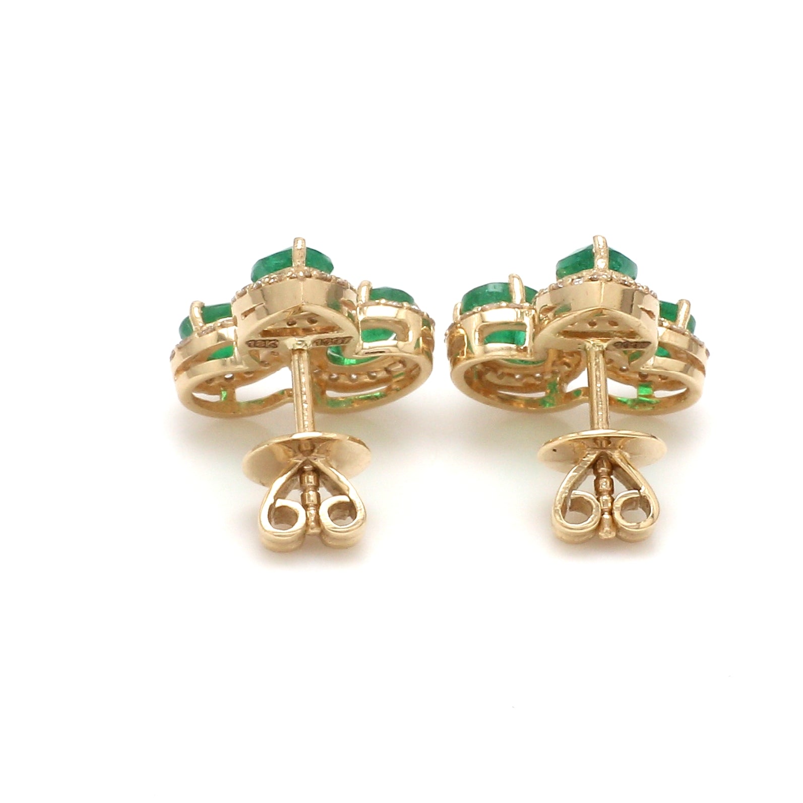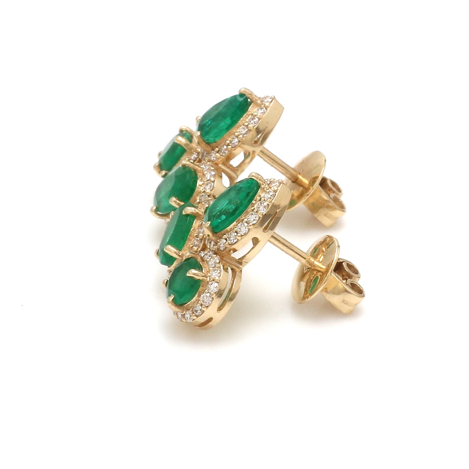 Triple Emerald & Diamond Halo Cluster Earrings in 14K Yellow Gold