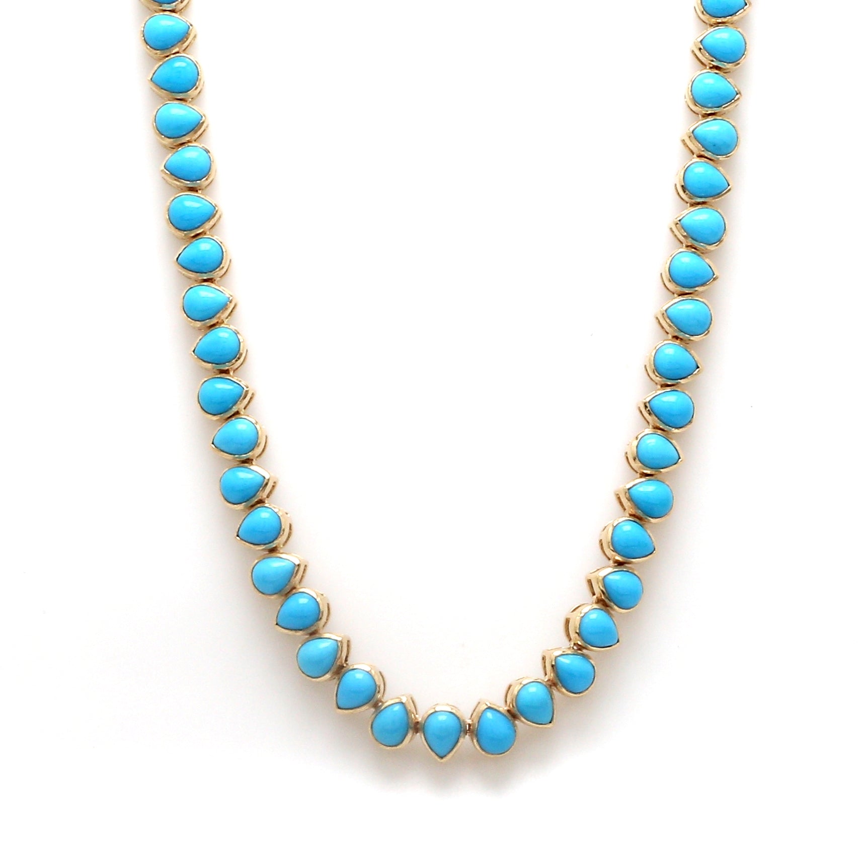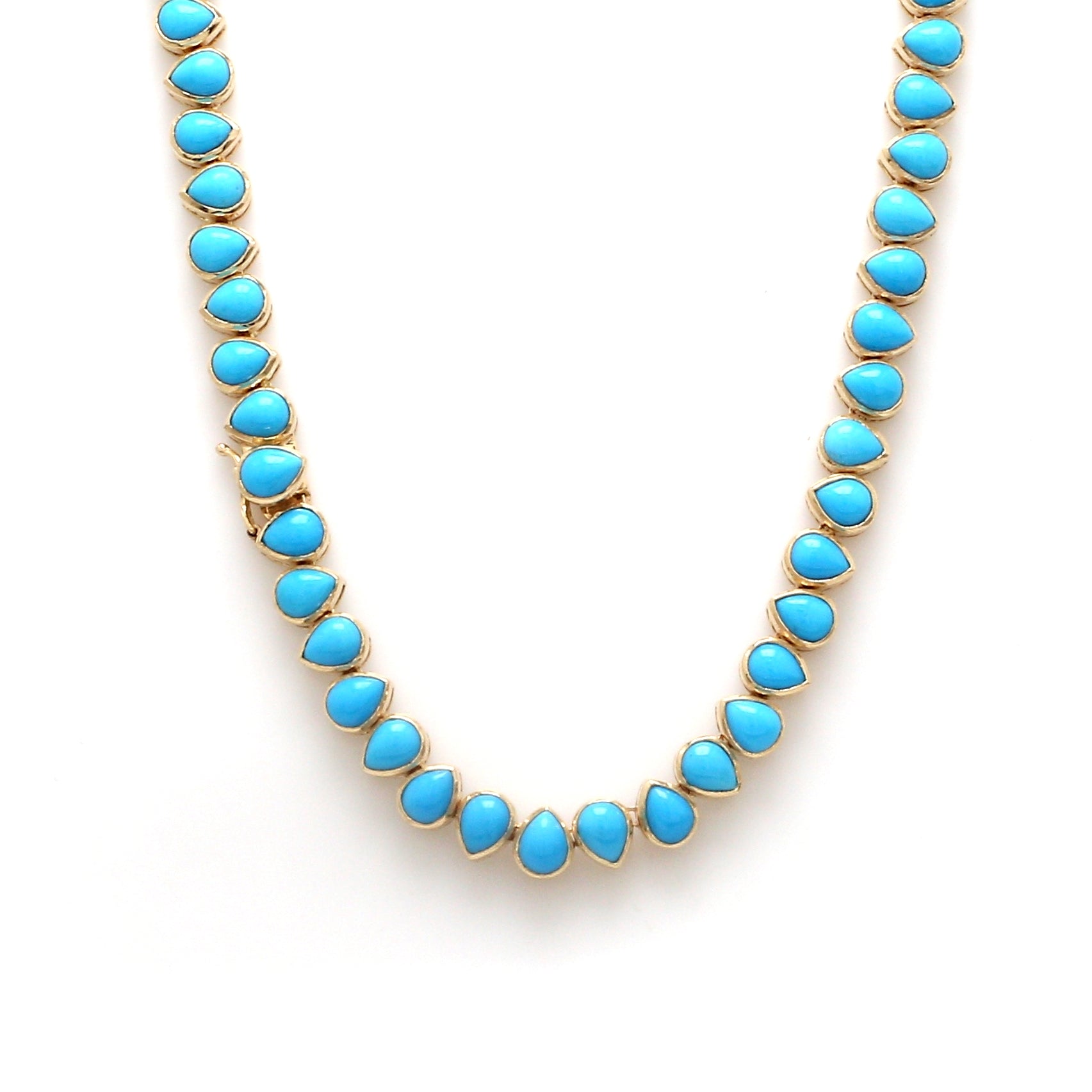 Turquoise Pear Bezel Set Tennis Necklace Gold | Upside Down Pear Turquoise Cabochon Tennis Necklace